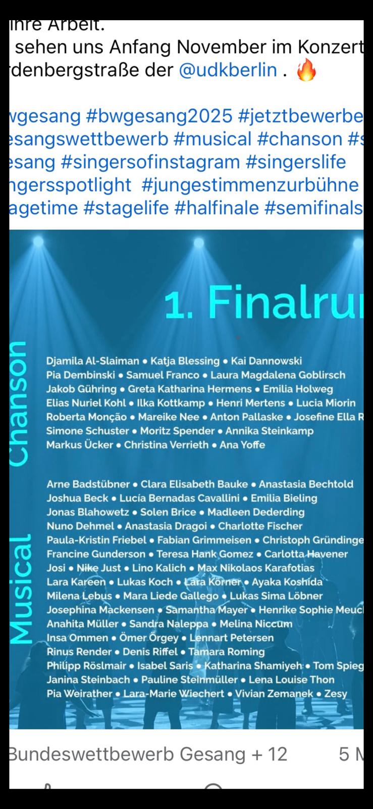 Wir freuen uns außerordentlich, dass Pia Weirather und Tamara Roming (Coached by Angelika Maier) beim Bundeswettbewerb Gesang Musical 2025 bis in die Finalrunden gekommen sind und nun zur Endausscheidung nach Berlin fahren dürfen. Herzlichen Glückwunsch